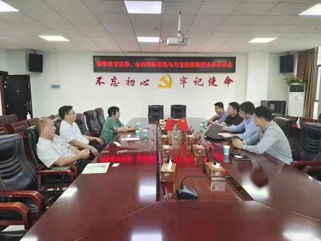 9月29日,國泰君安證券股份有限公司債務(wù)融資部業(yè)務(wù)董事陳洋、機構(gòu)客戶部執(zhí)行董事王晟,金谷國際信托公司廣東業(yè)務(wù)部執(zhí)行總經(jīng)理袁東陽一行,來萬寶投資集團開展融資業(yè)務(wù)洽談。萬寶投資集團董事長梁養(yǎng)賢率財務(wù)融資部負責(zé)人進行接洽并組織召開座談會。